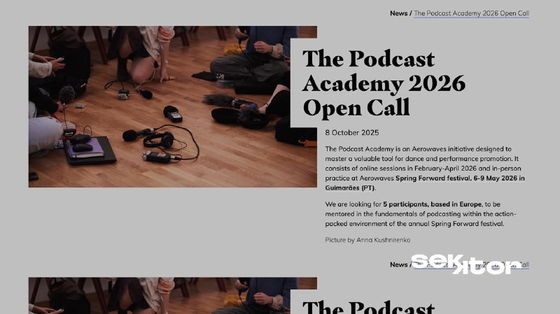 → Aerowaves адкрывае набор на The Podcast Academy 2026 — адукацыйную праграму па стварэнні падкастаў пра сучасны танец і перфарматыўнае мастацтва. Удзельнікі/-цы атрымаюць ментарскую падтрымку ад журналісткі Dany Mitzman (BBC, Deutsche Welle), навучацца асноўным этапам працы з падкастамі (ад запісу і інтэрв’ю да мантажу і публікацыі).