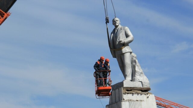 На фота: на цэнтральнай плошчы Смаргоні зьносяць помнік Уладзіміру Леніну, 2019 год