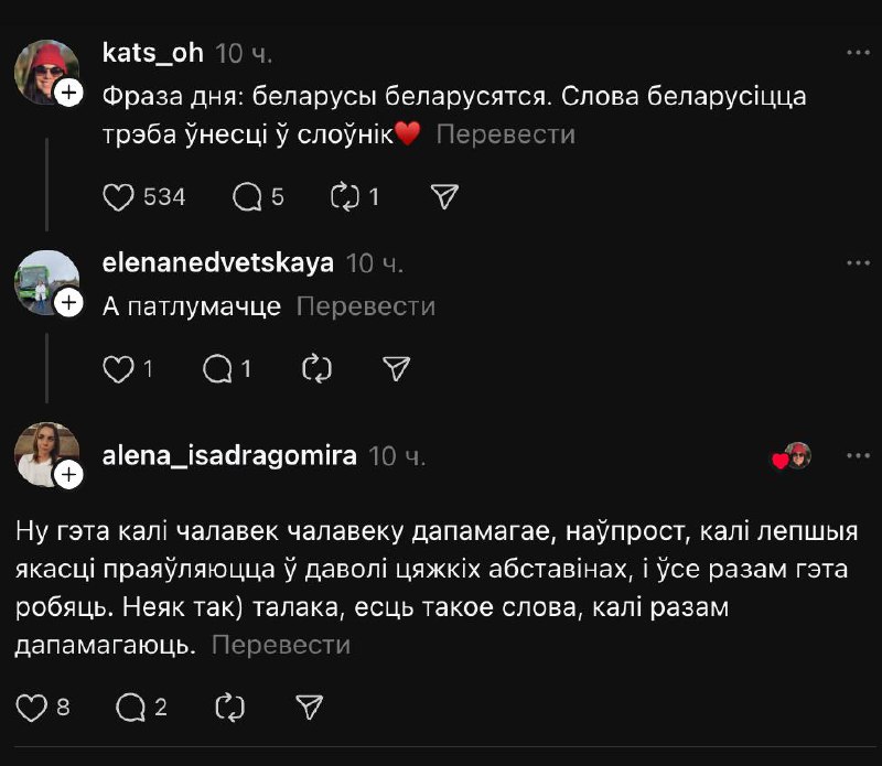 Беларуска прапанавала “выраз дня” ў Трэдс: “беларусы беларусяцца”. Гэта калі беларусы актыўна дапама… 10.01.2026Вольны Захад інфа Беларуска прапанавала “выраз дня” ў Трэдс: “беларусы беларусяцца”. Гэта калі беларусы актыўна дапамагаюць адно аднаму.Як вам новы выраз?