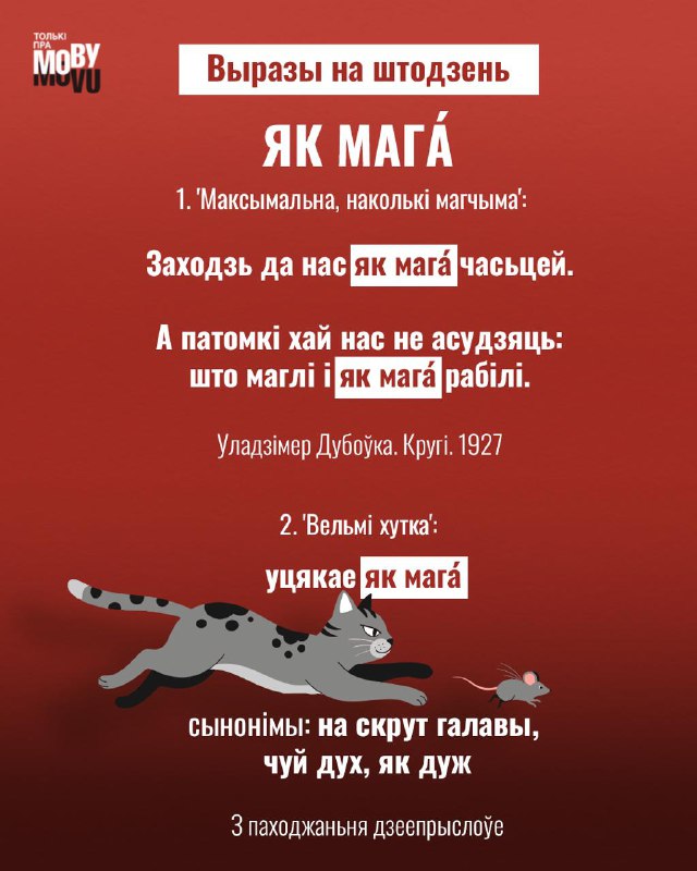 Гэты максымальна кароткі, але максымальна ёмісты беларускі выраз — пра максымум. І пра найвышэйшую ступень намаганьняў (старайся як магá!), і пра максымальную праяву нечага (трымайцеся як магá даўжэй!). Унь дзядзька йдзе! — гукаюць дзеці. Забылі ўсё яны на сьвеце і як магá бягуць, сьмяюцца… (Якуб Колас. Новая зямля). ☞ Слова магá — колішняе дзеепрыслоўе ад магчы.