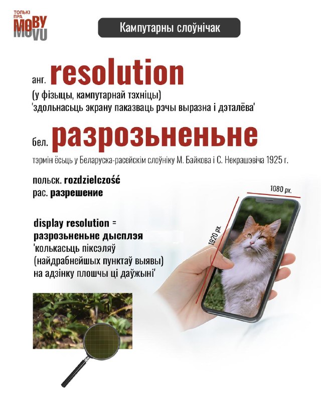 Няма патрэбы ўжываць ангельскі тэрмін, калі маем сваё адпаведнае слова. Ангельскаму resolution у апт… 04.02.2026Вольны Захад інфа Няма патрэбы ўжываць ангельскі тэрмін, калі маем сваё адпаведнае слова. Ангельскаму resolution у аптычным значэньні найлепш адпавядае разрозьненьне. Яно тым вышэйшае, чым больш dots per inch (DPI) = пунктаў на цалю.