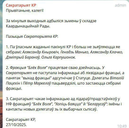Заява ад фракцыі “Воля” і большасьці ад яе спіса, пакінуўшай КР 26 кастрычніка 2025:Паводле п.3.3 Ст…